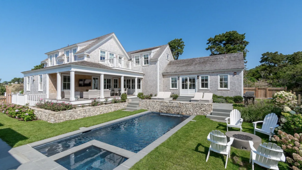 This stunning home has a pool, hot tub, and a pond, all while being super close to the hubs of Marthas Vineyard!